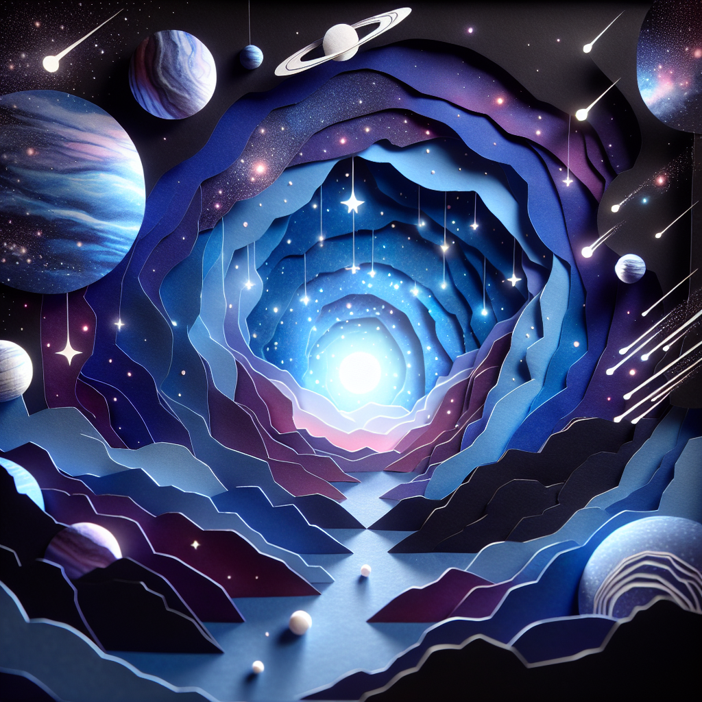 Travel beyond the stars with this ethereal paper world. Featuring delicate cutouts of planets, shooting stars, and swirling galaxies, this piece captures the beauty of the cosmos. The interplay of deep blues and purples creates a dreamy atmosphere, inviting the viewer to reach out and touch the stars.