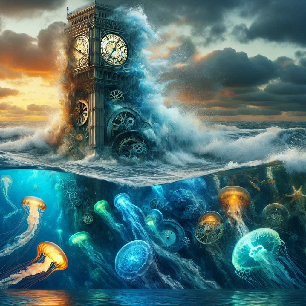 Witness the ocean’s timeless dance as waves crash against a colossal clock tower, half-submerged in the foamy surf. The waters shimmer with iridescent colors, reflecting the sky above, which shifts from dawn to dusk in a breathtaking gradient. Surreal marine life swims around the tower, embodying the harmony between time and nature.