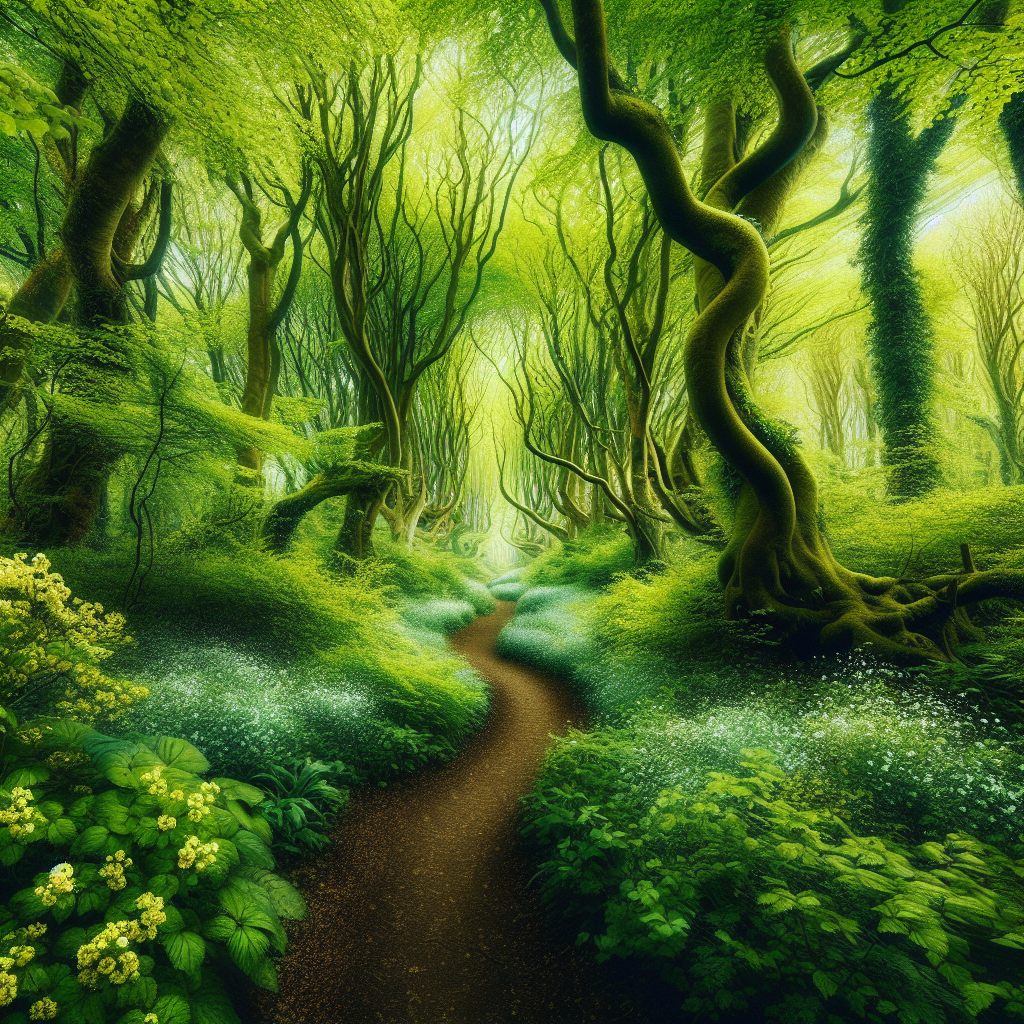 Follow a winding path through the forest, where every step is accompanied by the gentle rustle of leaves and the distant call of birds. The trail is framed by flowering shrubs and towering trees, beckoning adventurers to lose themselves in nature’s embrace.