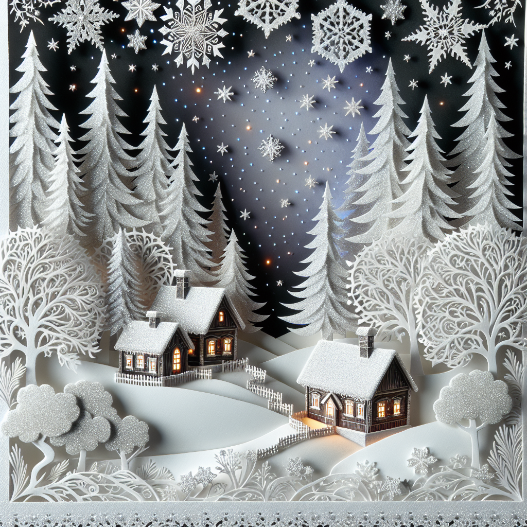 Embrace the magic of winter with a stunning paper cutout scene depicting a snowy landscape, twinkling lights, and cozy cottages. The intricate details of snowflakes and frosted trees create a serene and enchanting atmosphere, transporting viewers to a peaceful winter retreat.